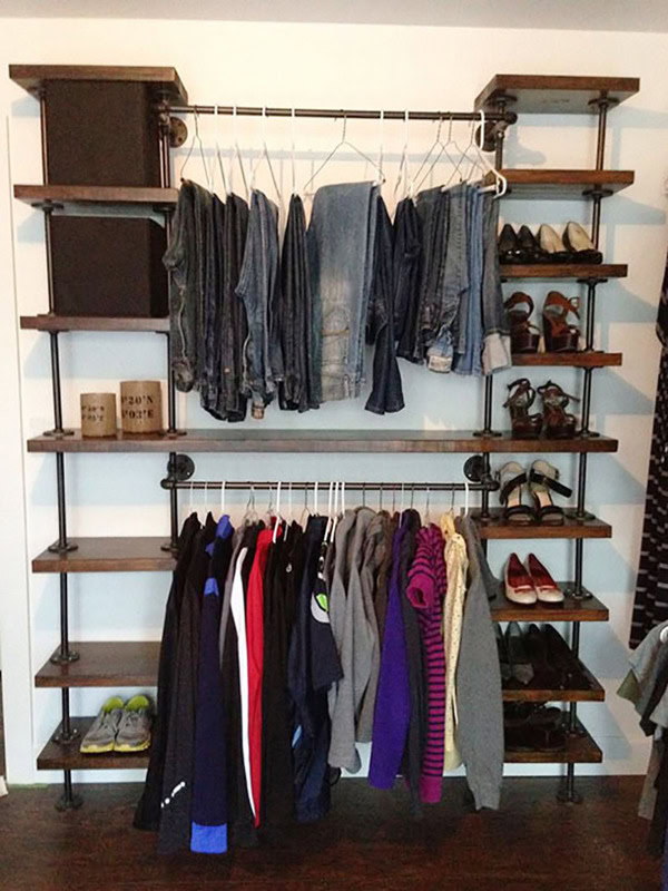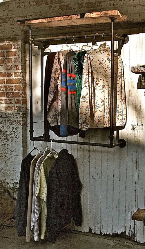 For those who need a multi-purpose solution, this design combines garment rails for hanging clothes with shelving for shoes or accessories. Mixed painted pipes with metallic fittings creates a stylish industrial aesthetic, making it suitable for both modern homes and boutique-style shops. The shelving can be customised to the exact width and depth you need, allowing for maximum functionality. By merging two storage systems into one, this is one of the most efficient wall mounted clothes rail ideas.